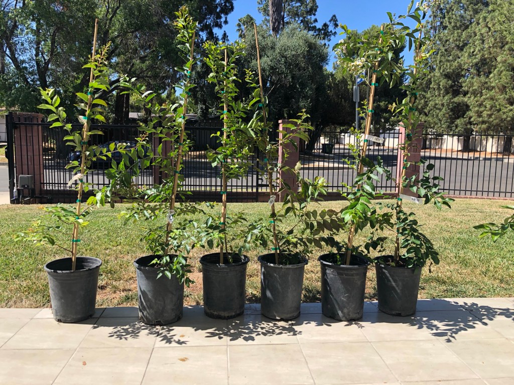 After cutting them down, my husband and I discussed possible options with our gardener and consulted Google. I had heard that Los Angeles County residents could receive free trees for their residence and the parkway.