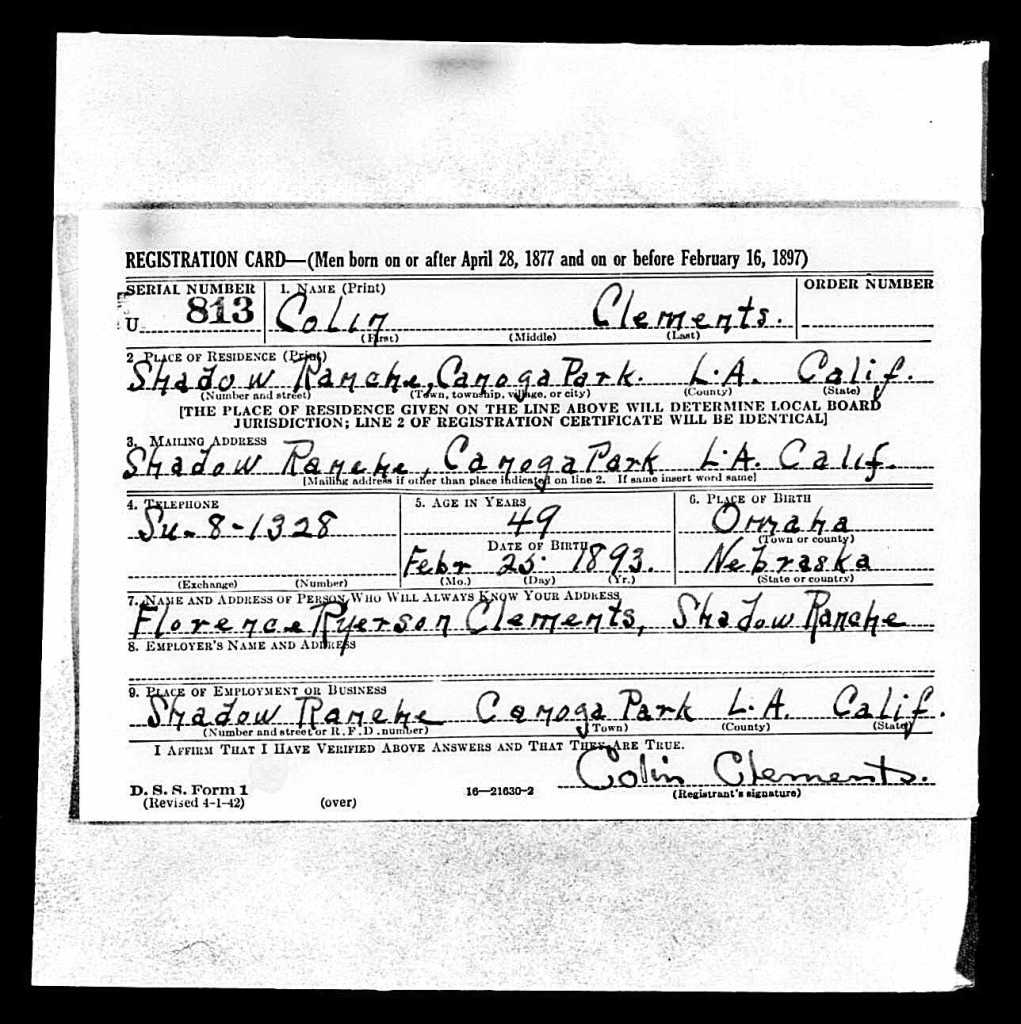 Colin Clements was born February 25, 1893 in Omaha, NE. His father was born in England and his mother born in Indiana from Dutch and Prussian heritage. His father was a cattle driver in Omaha. In 1917 he graduated from the University of Washington.