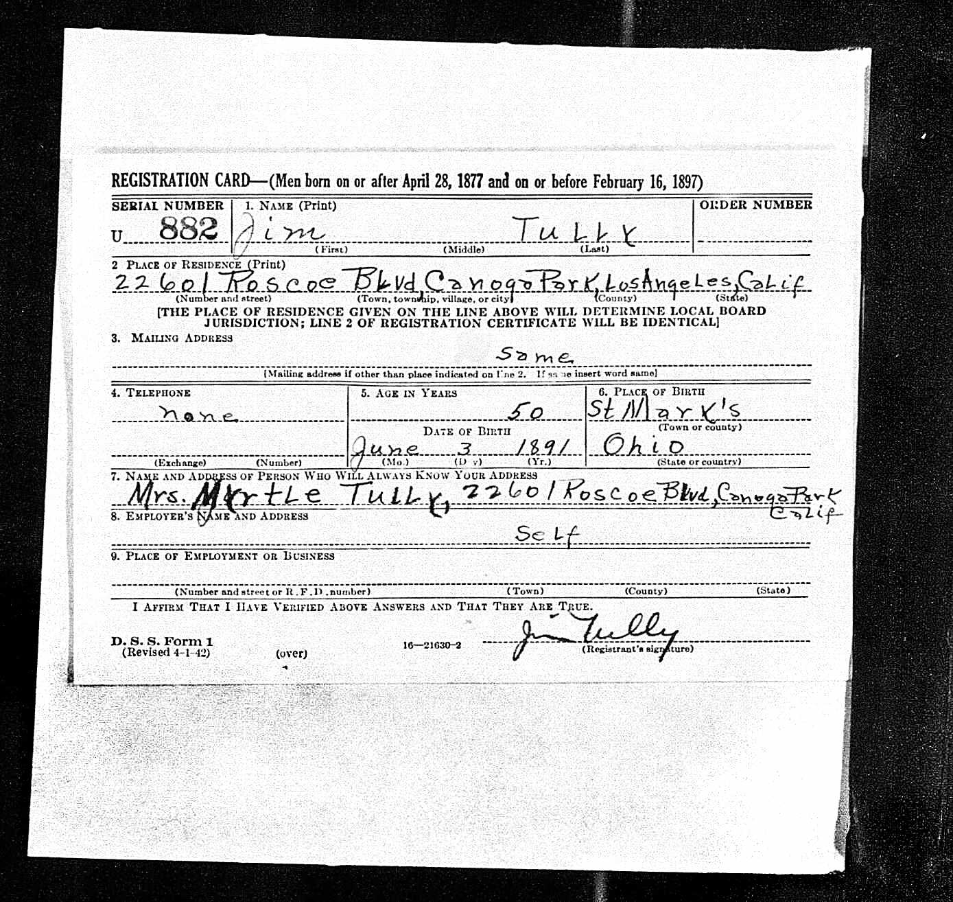 Jim Tully, orphaned as a young boy, turned vagabond, prizefighter/boxer, tree surgeon, later a writer, once lived in Canoga Park, CA. According to Wikipedia, he was born on June 3, 1886. His WWI Draft Record has his birth as June 3, 1891 as well as his headstone states (1891).